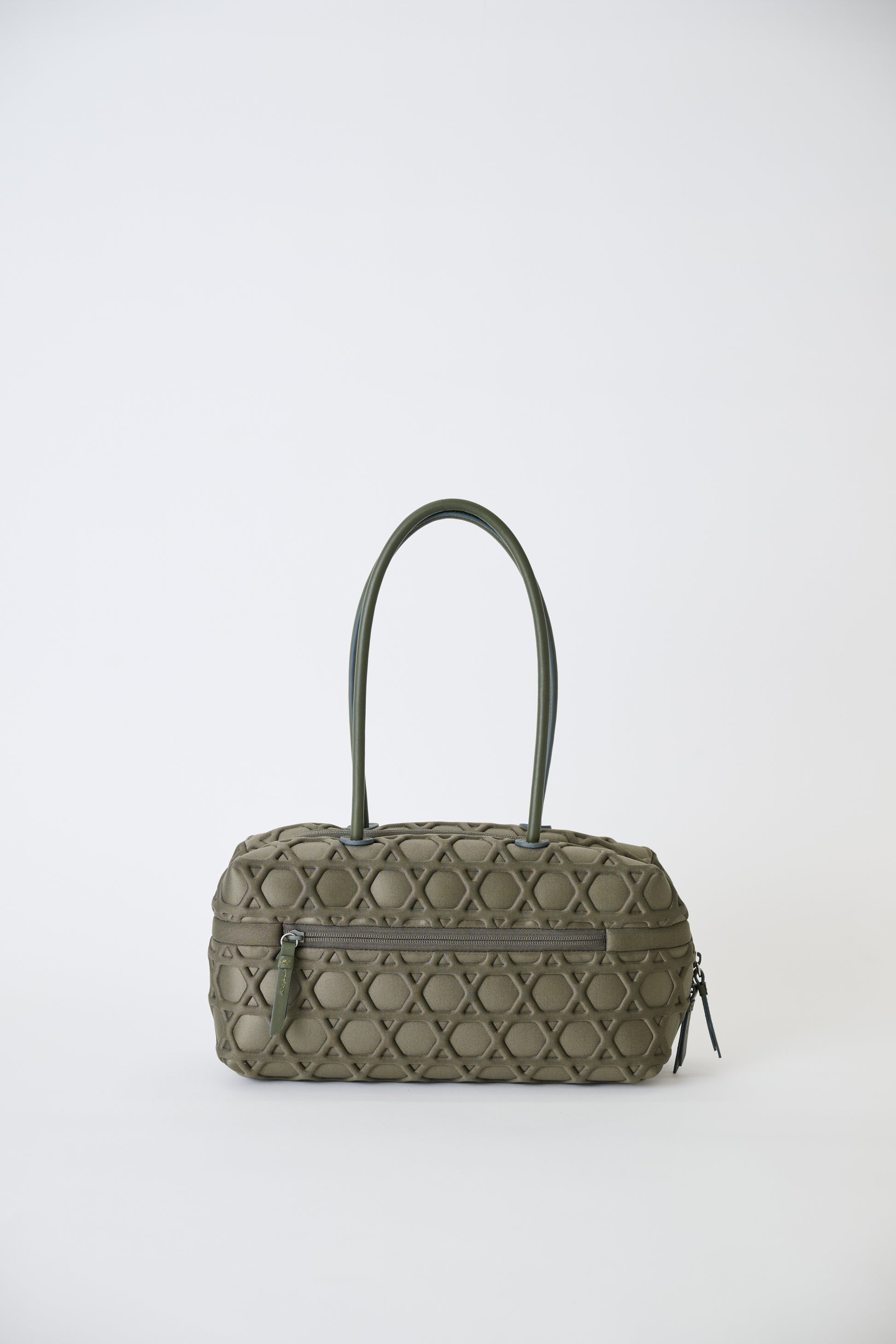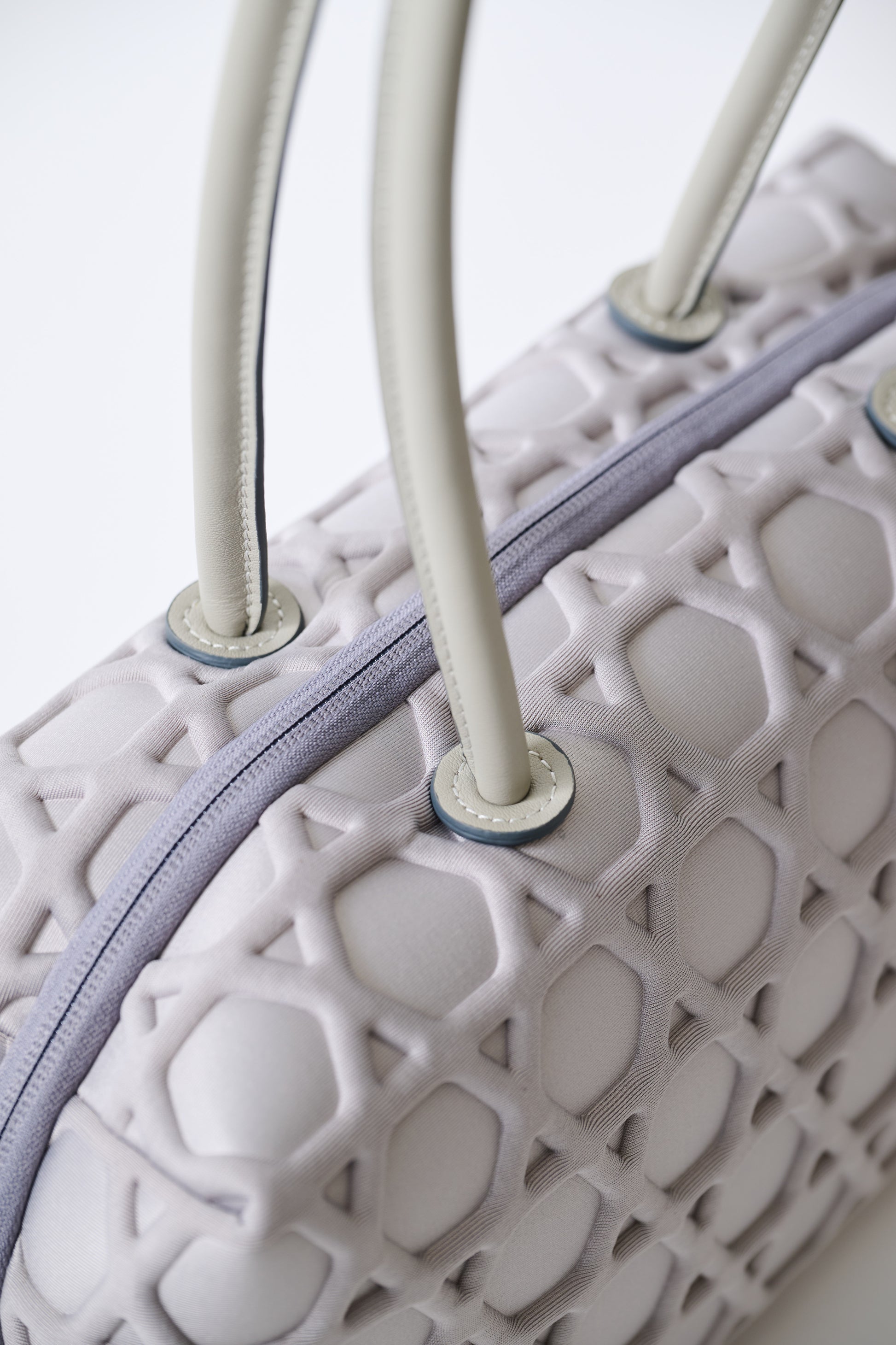 肉厚なウレタン材に施したエンボス(型押し)の篭目文様は規則的なパターンが織りなす絶え間ない連続性から、繁栄や安定、絆、繋がりを象徴しています。