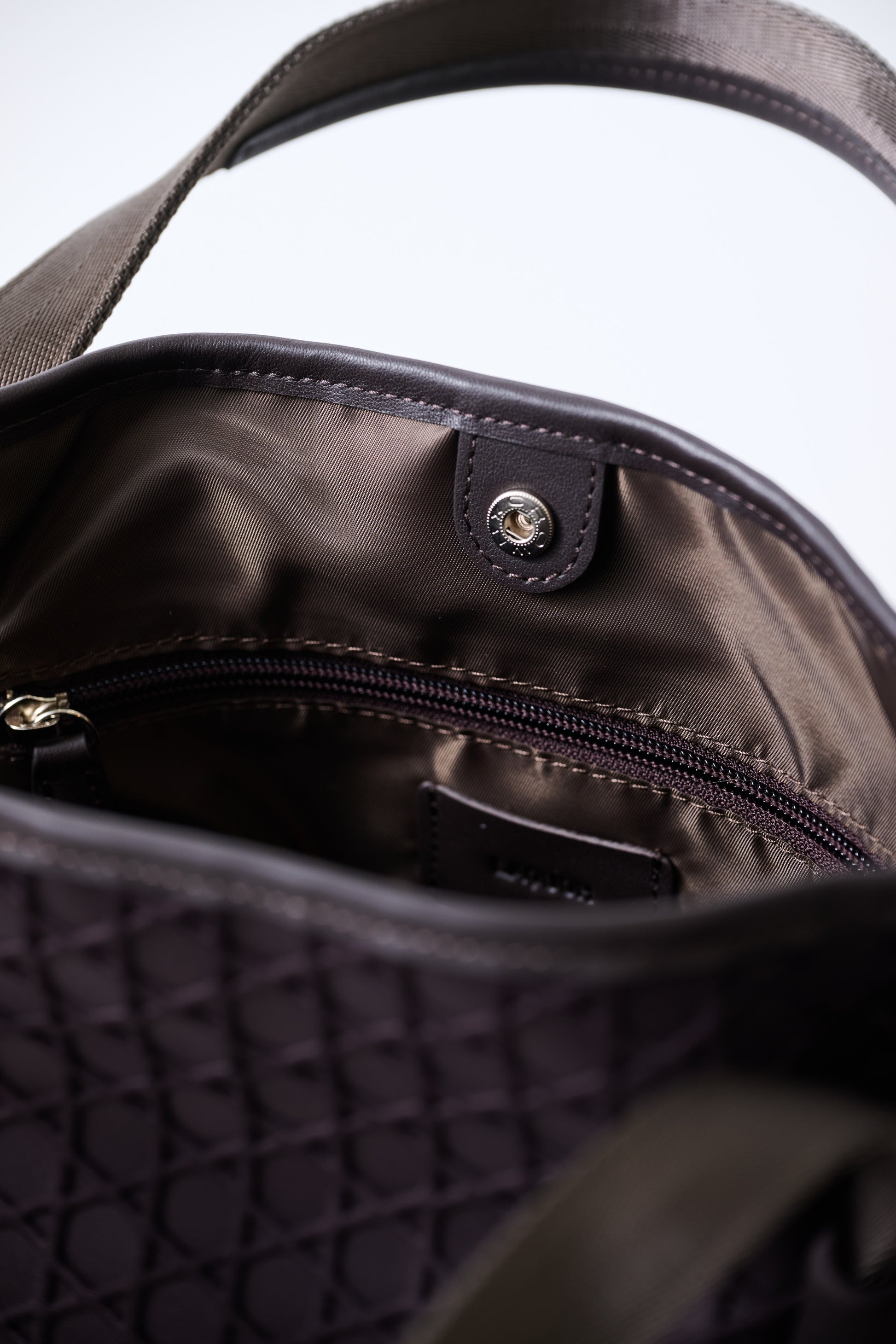 本体とマチをつくるナイロンテープが、ミニマルなフォルムに程よいアクセントを添えています。